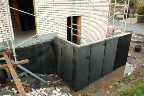 On le trouve généralement sur des terrains en pente. Constat : drainage et étanchéité mal effectués. Cela implique de recreuser derrière les murs enterrés. Des murs de soutènement en escalier du terrain sont à effectuer. Les doubles nopes permettent le rivetage des membranes en fin de rouleau.